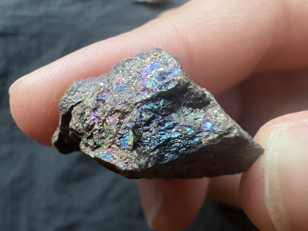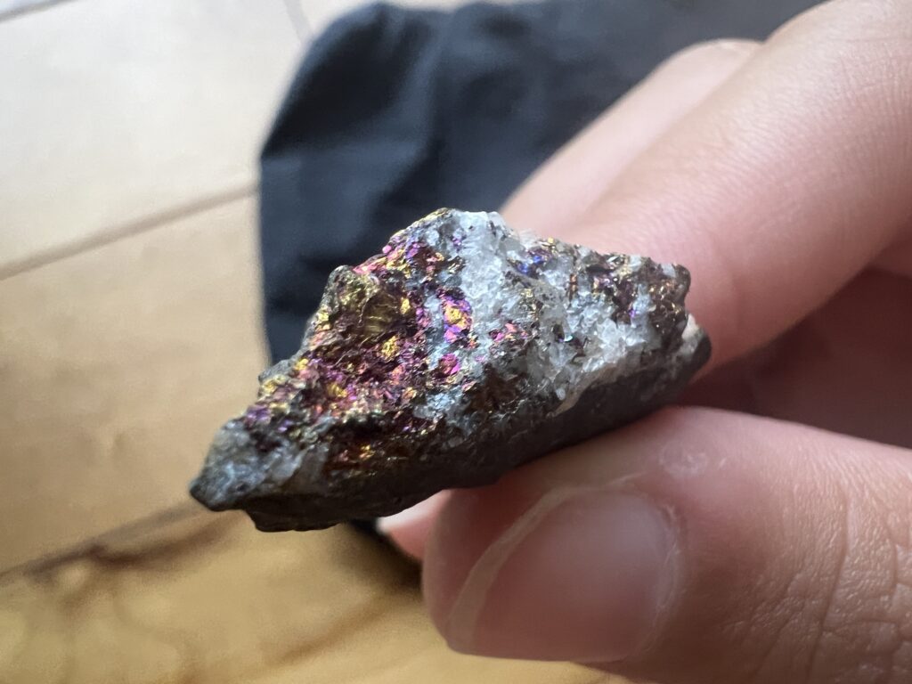 上の2枚は斑銅鉱。銅の硫化鉱物で酸化するとこのように虹色に変化するんだそう。